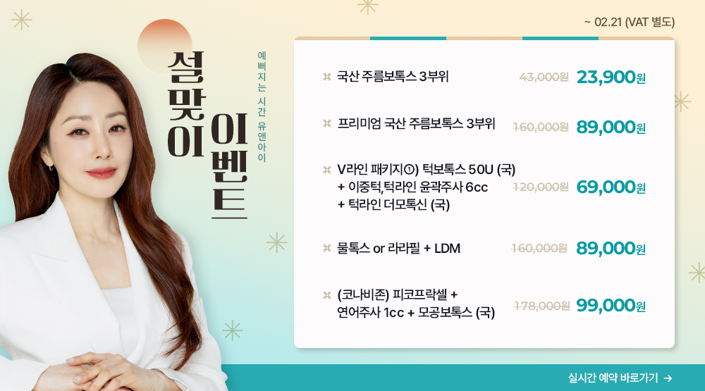 새해E) V라인 패키지 1) 사각턱보톡스 50u (국) + 이중턱,턱라인 윤곽주사 6cc + 턱라인 더모톡신 (국)