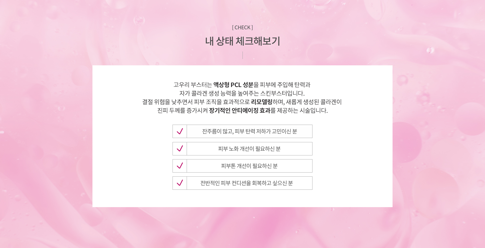 피부 내에 콜라겐 생성을 촉진시켜 피부 탄력과 구조를 리모델링해주는 스킨부스터 시술입니다